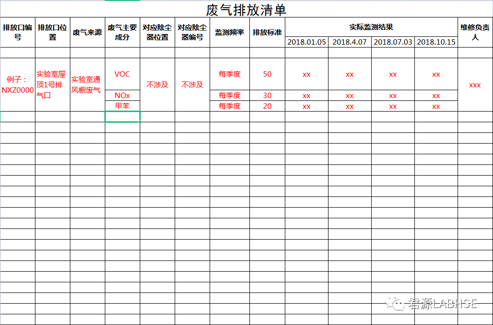 1.1实验室应当定期对实验室产生的废气(如:挥发性有机物)进行系统识别,识别应当包括其成分、产生点、可能的量、排放点等,以便尽可能全面的对其进行收集和处理,达标后排放。该识别应当定期进行并在实验室设计之初就进行,因为设计之初如果考虑到了废气的处理总比运营后再进行改造要成本、高效的多。附件4是一个供参考的废气排放清单附件4:废气排放清单模板.xlsx